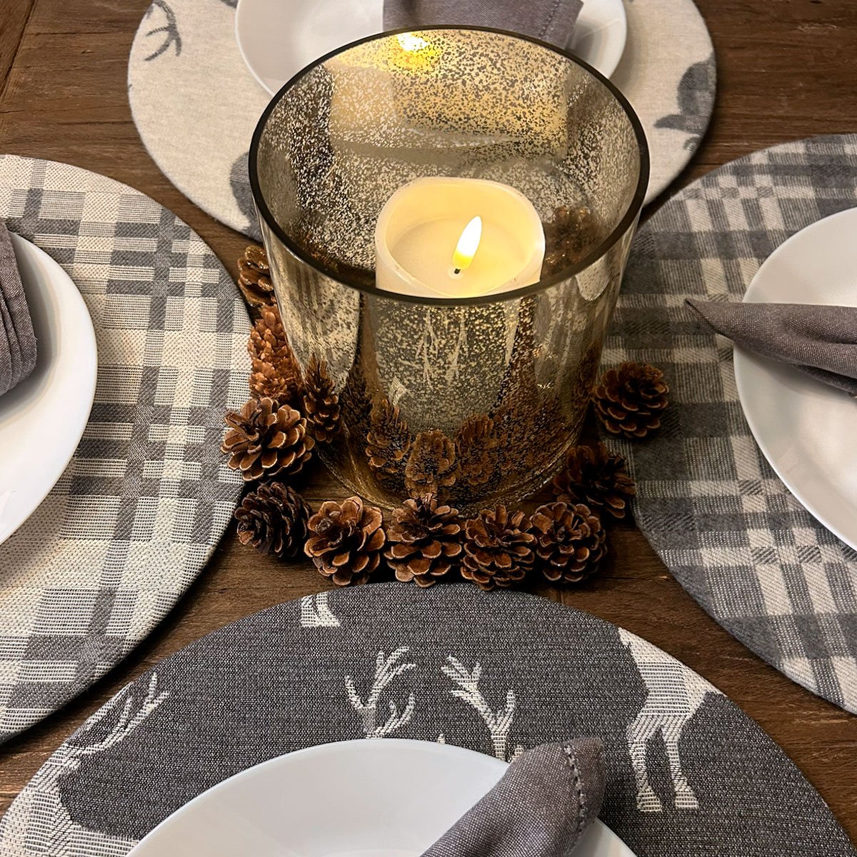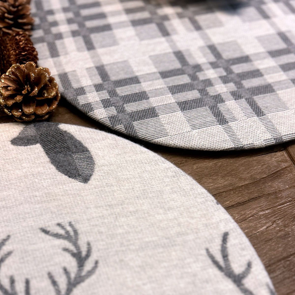 La collezione Montagna nasce dall’atmosfera calda degli chalet, dal profumo del legno, dalle cene lente davanti al camino. Sottopiatti sfoderabili che raccontano la natura alpina attraverso tessuti materici effetto lana e lino, ricami di cervi, stelle alpine, tartan e nuance ispirate alle rocce, alle foreste e alla neve.