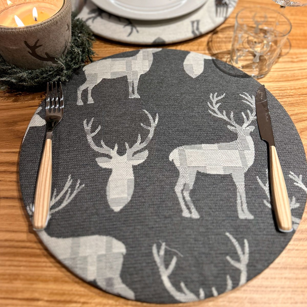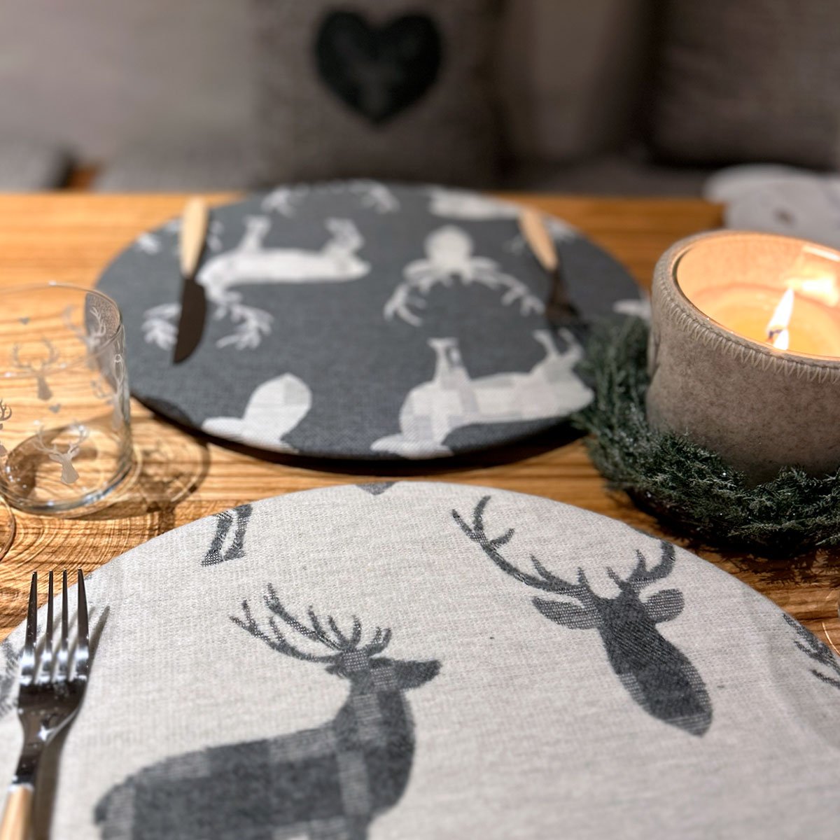 La collezione Montagna nasce dall’atmosfera calda degli chalet, dal profumo del legno, dalle cene lente davanti al camino. Sottopiatti sfoderabili che raccontano la natura alpina attraverso tessuti materici effetto lana e lino, ricami di cervi, stelle alpine, tartan e nuance ispirate alle rocce, alle foreste e alla neve.