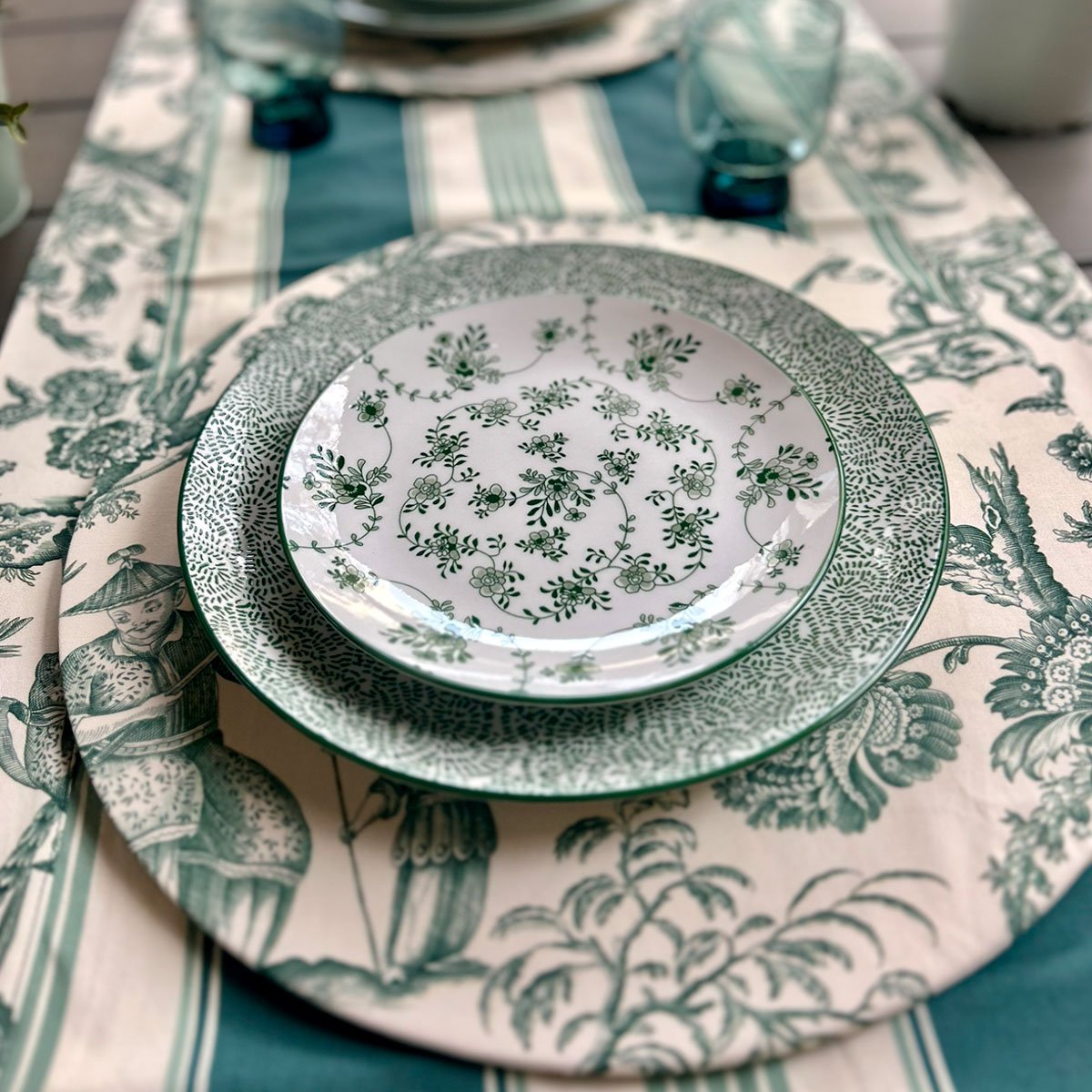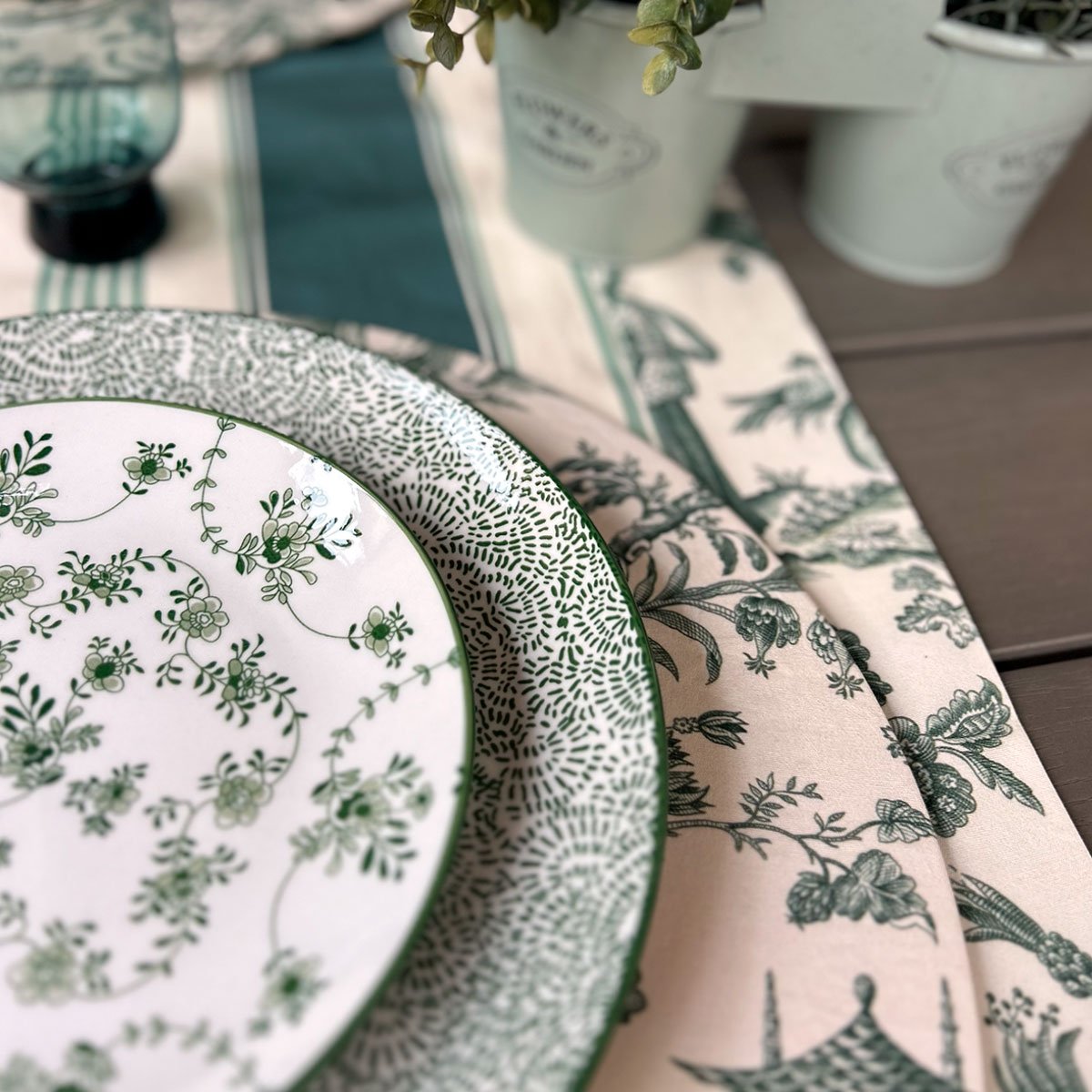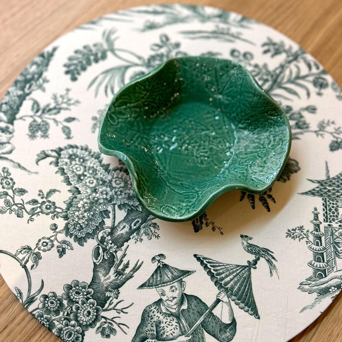 Oriental Garden nasce dall’incontro tra tessile decorato e ceramica artigianale, trasformando la tavola in un paesaggio ricco di colori e dettagli.