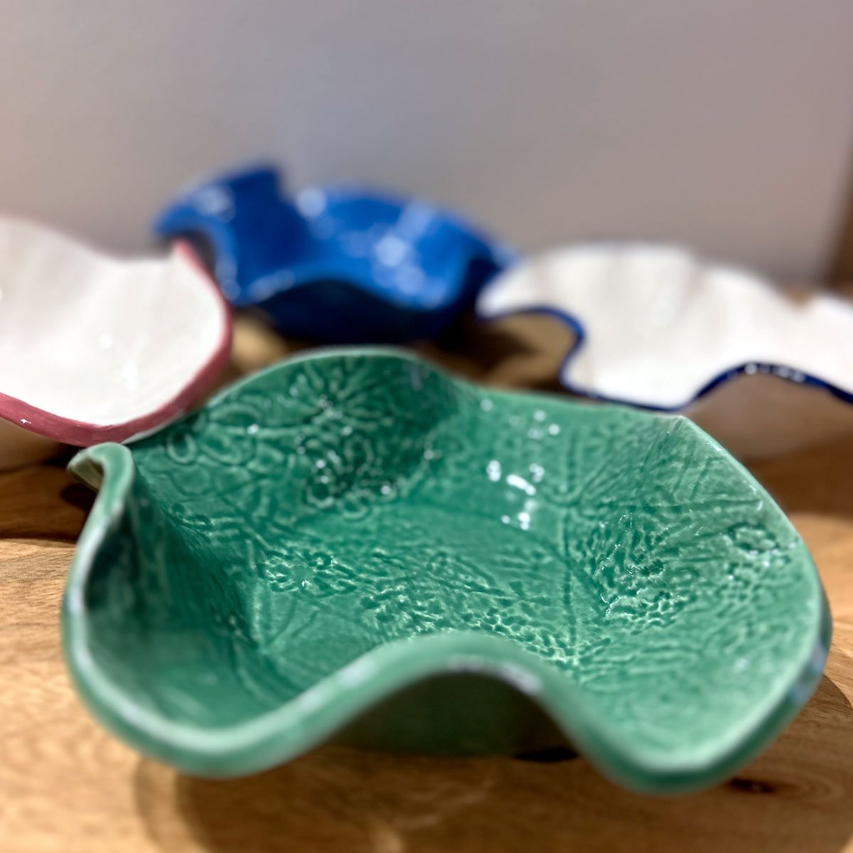 I sottopiatti della collezione dialogano con una serie di piattini in ceramica realizzati in collaborazione con Ceramiche Loalma, creando un equilibrio raffinato tra materia, decorazione e cromia.